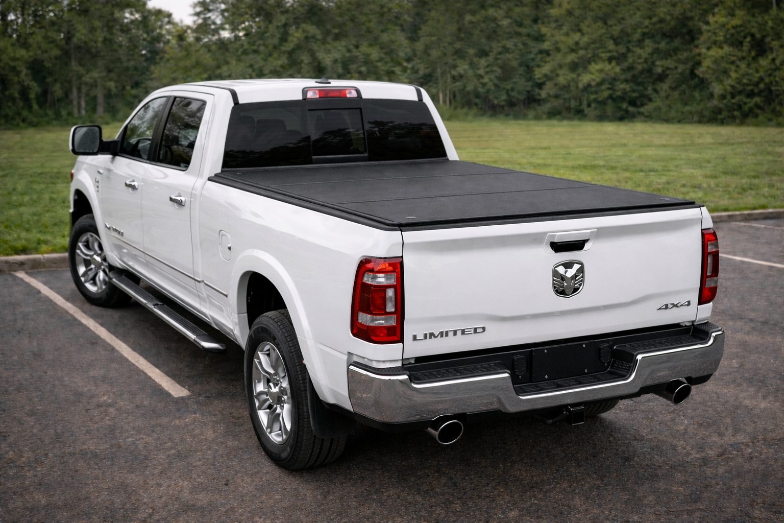 This Dodge Ram hard tri-fold tonneau truck bed cover redefines utility and style. Crafted with premium-grade, lightweight aluminum, this cover offers unmatched strength while remaining easy to handle. Its low-profile, matte-coated panels deliver a refined, modern aesthetic while shielding your cargo from the harshest weather — all without any visible seams or exposed hinges for a clean, uninterrupted look.